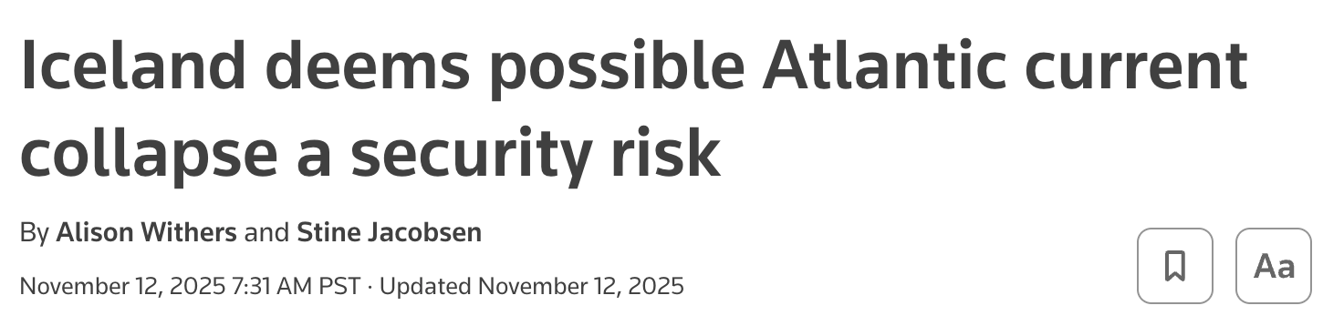 Iceland is further along. In November 2025, their climate minister brought AMOC collapse before the National Security Council as an existential threat—the first time any country had formally treated a specific climate phenomenon that way. “We cannot afford to wait for definitive, long-term research before acting,” Climate Minister Johann Pall Johannsson said. Stage one complete, working through stage two.
