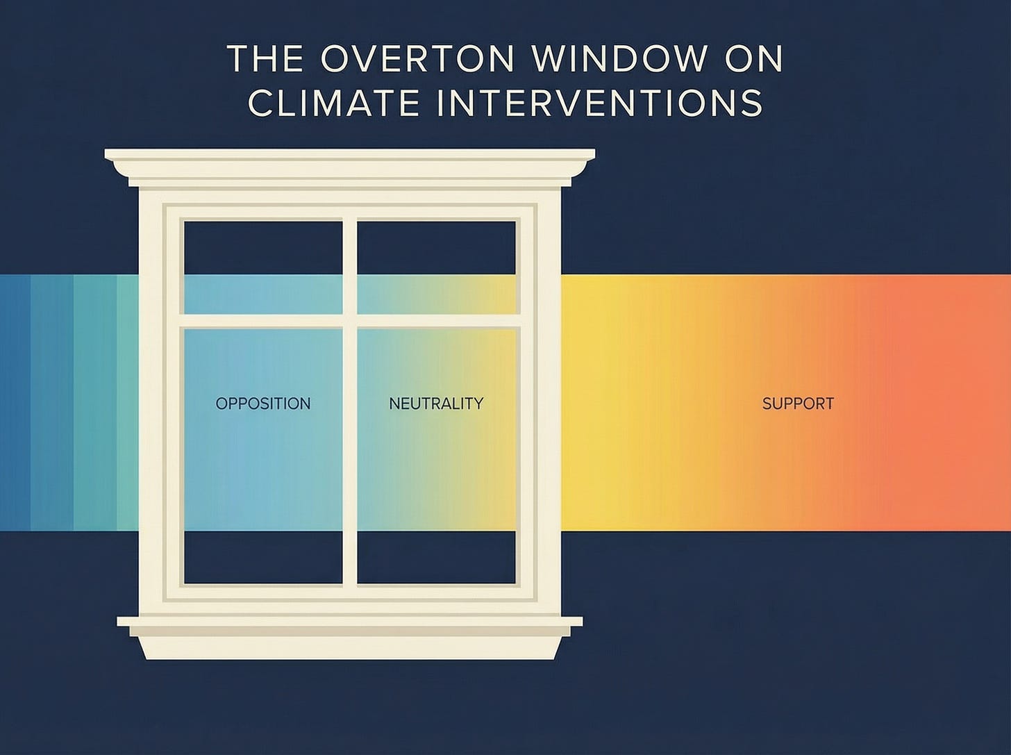 The Overton window for discussing interventions that respond to catastrophic climate risk currently runs from vociferous opposition to careful neutrality, and that’s the entire range of acceptable opinion. There’s almost no space for someone to say “I think we need to seriously prepare for these interventions” without facing professional consequences.
